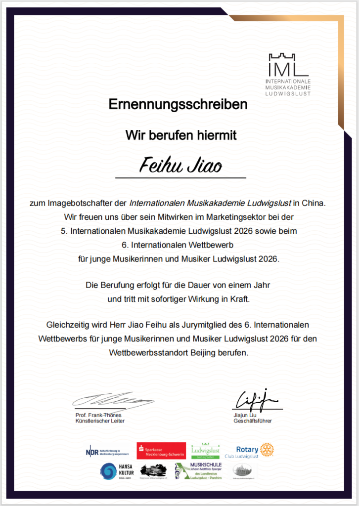 Der renommierte Dirigent, Komponist und Pianist Feihu Jiao wurde offiziell zum chinesischen Repräsentanten und Markenbotschafter des Der 6. Internationale Wettbewerb für junge Musikerinnen und Musiker in Ludwigslust 2026 sowie des Ludwigsluster Musikfest ernannt. In dieser Funktion wird er den musikalischen und kulturellen Austausch zwischen China und Deutschland weiter fördern und vertiefen.
